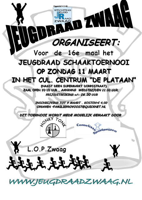 Op zondag 11 maart is het weer zover dan organiseert JeugdRaad Zwaag voor de 16e maal een jeugdschaaktoernooi voor alle jeugd t/m 16 jaar.